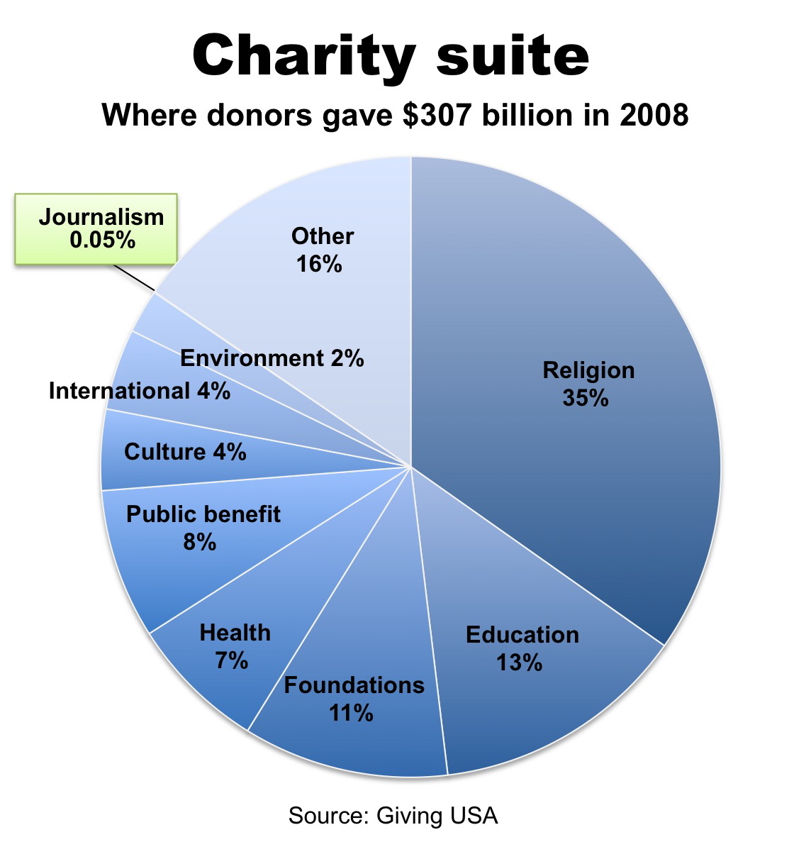 As reported recently in the annual State of News Media study by the Pew Project for Excellence in Journalism, Jan Schaffer of the J-Lab at American University estimated that only $141 million (not including public broadcasting) of philanthropic support has gone into nonprofit journalism efforts in the last four years. The sum is less than 0.05% of the $307 billion given to charity in 2008 alone.
